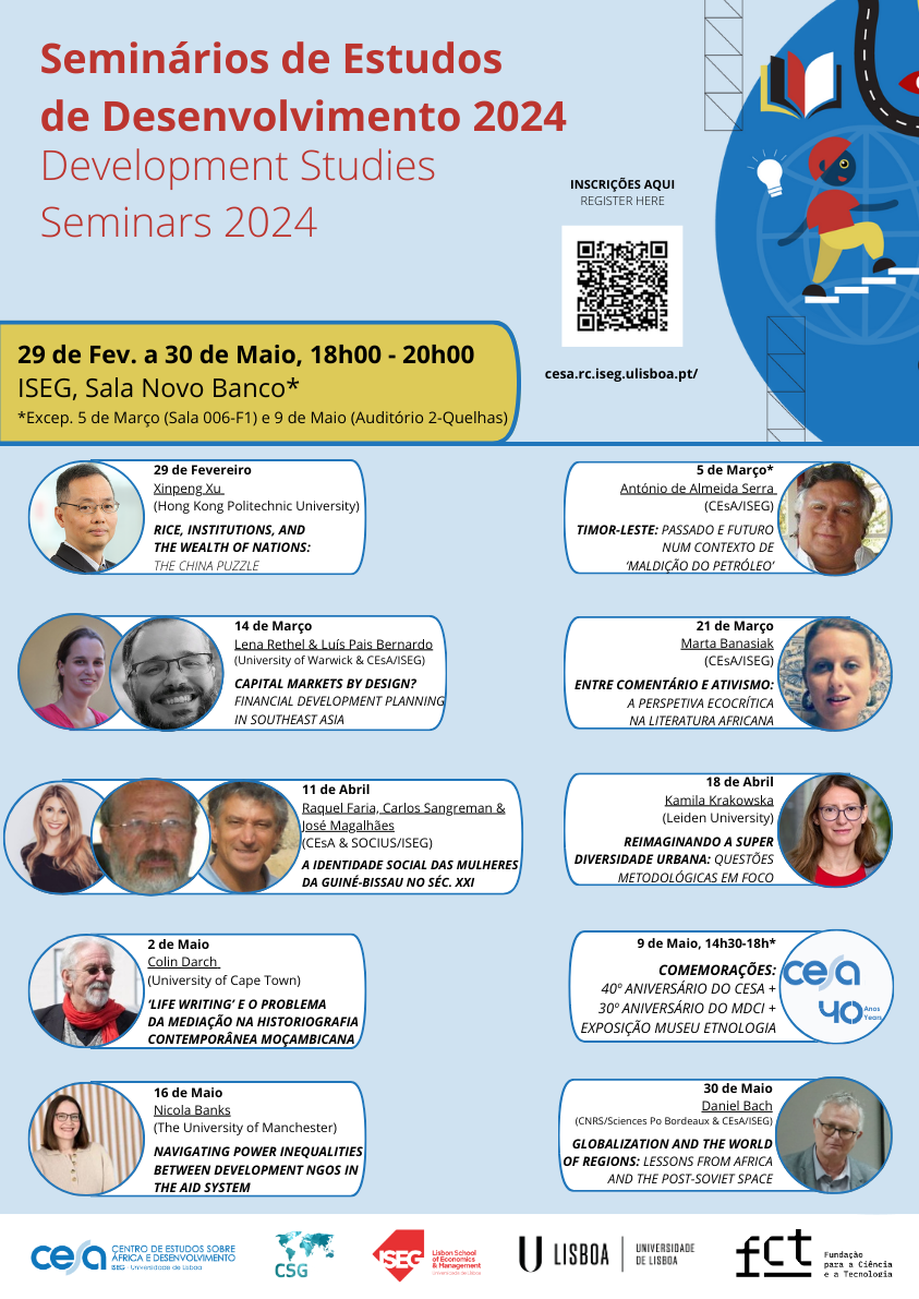 O Centro de Estudos sobre África e Desenvolvimento (CEsA/CSG/ISEG/ULisboa) e as coordenações dos cursos de Mestrado em Desenvolvimento e Cooperação Internacional (MDCI) e do Doutoramento em Estudos de Desenvolvimento (PDED) do ISEG – Lisbon School of Economics and Management, da Universidade de Lisboa (ULisboa), convidam para os Seminários de Estudos de Desenvolvimento 2024 — um ciclo de 10 apresentações de investigadores/as convidados/as que instigam a refletir sobre diversos assuntos no campo dos Estudos de Desenvolvimento.