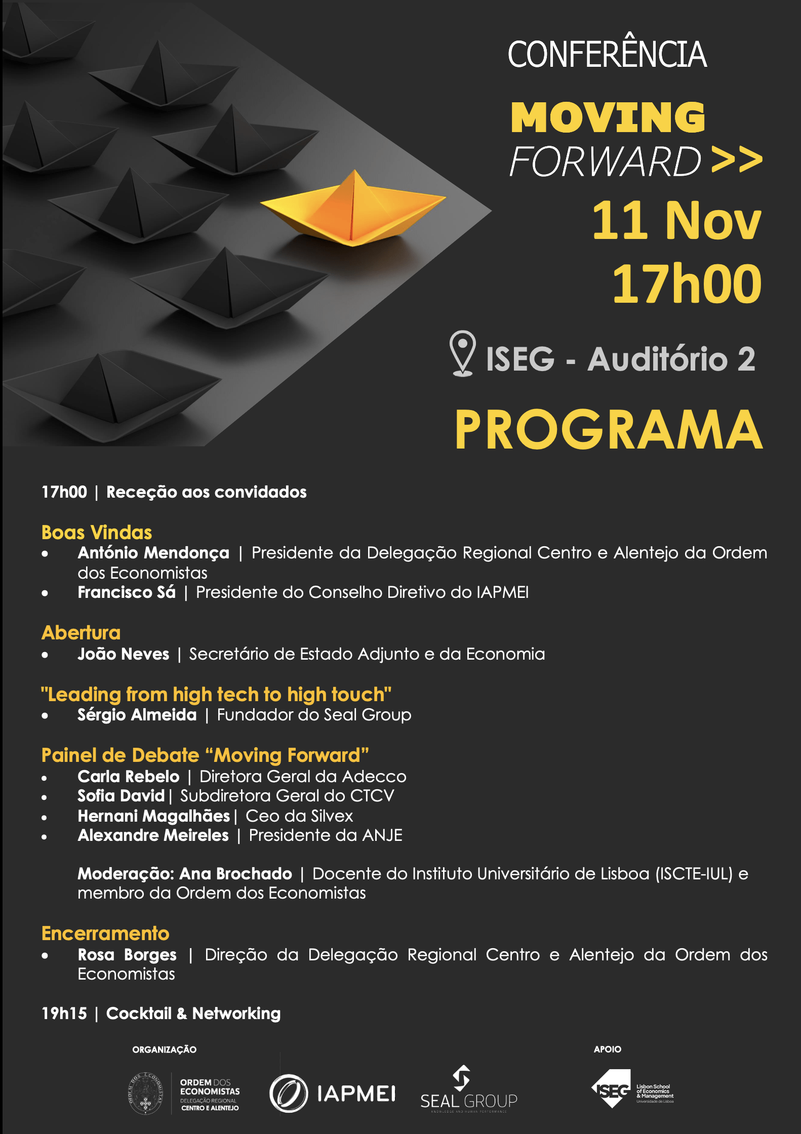 A Delegação Regional Centro e Alentejo da Ordem dos Economistas (DRCA), o IAPMEI e o Seal Group organizam a conferência “Moving Forward” no ISEG, no dia 11 de novembro, às 17h00, no Auditório 2.