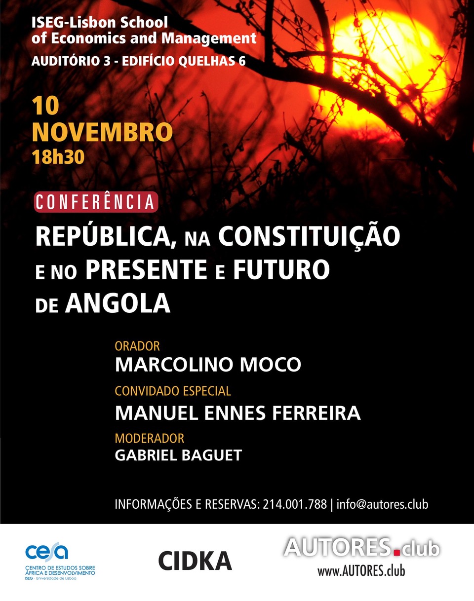 Hoje, 10 de novembro, realiza-se no ISEG a conferência “República, na Constituição e no Presente e Futuro de Angola”, com a participação de Marcolino Moco (antigo primeiro-ministro de Angola), do professor do ISEG Manuel Ennes Ferreira e do jornalista Gabriel Baguet.