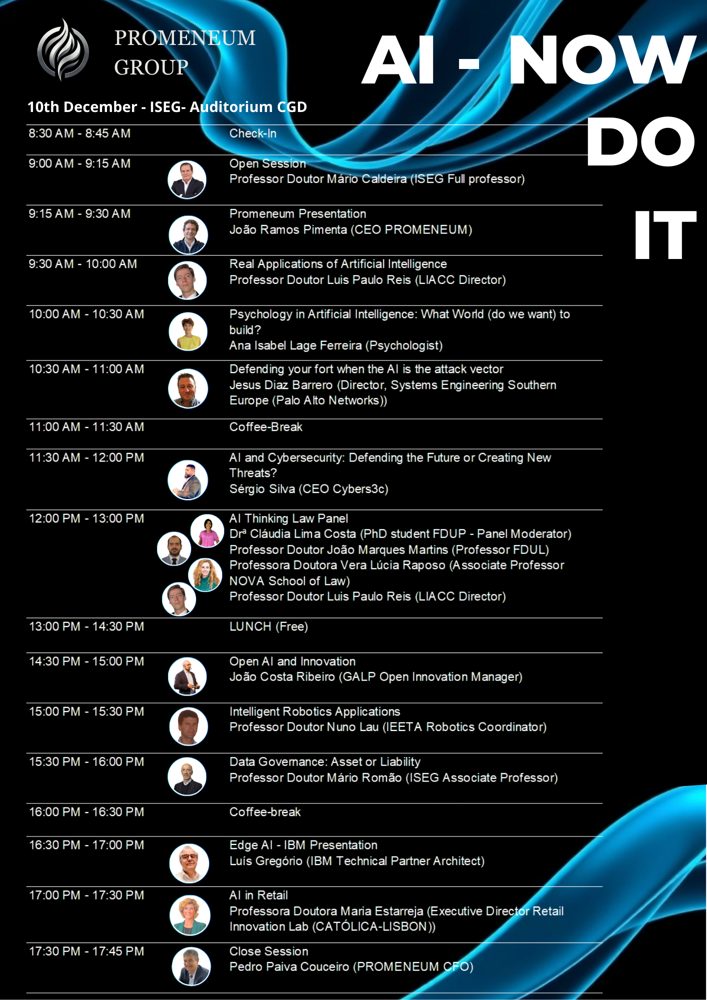 O programa inclui apresentações sobre robótica inteligente na indústria, algoritmos de Inteligência Artificial aplicados a departamentos jurídicos e escritórios de advocacia e de psicologia, inovação no Retalho e como garantir privacidade e confidencialidade adicionando ferramentas robustas de cibersegurança.