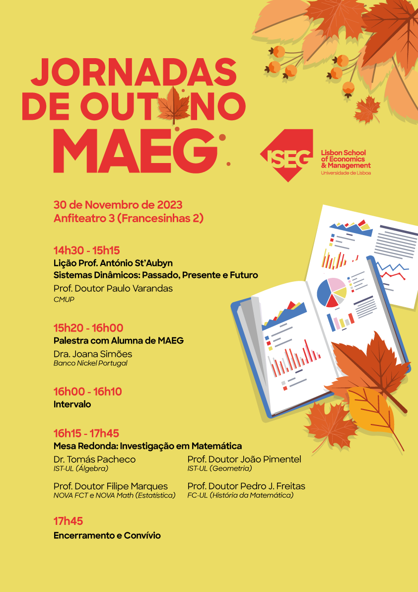 Início / Eventos Cursos e Workshops Jornadas de Outono de MAEG 30 Nov 2023 das 14:30 às 17:45 ISEG, Anfiteatro 3 (Edifício Francesinhas II) As Jornadas de Outono de MAEG decorrem no dia 30 de novembro, no Anfiteatro 3 (Piso 0 do Edifício Francesinhas 2). Entrada livre. Programa: