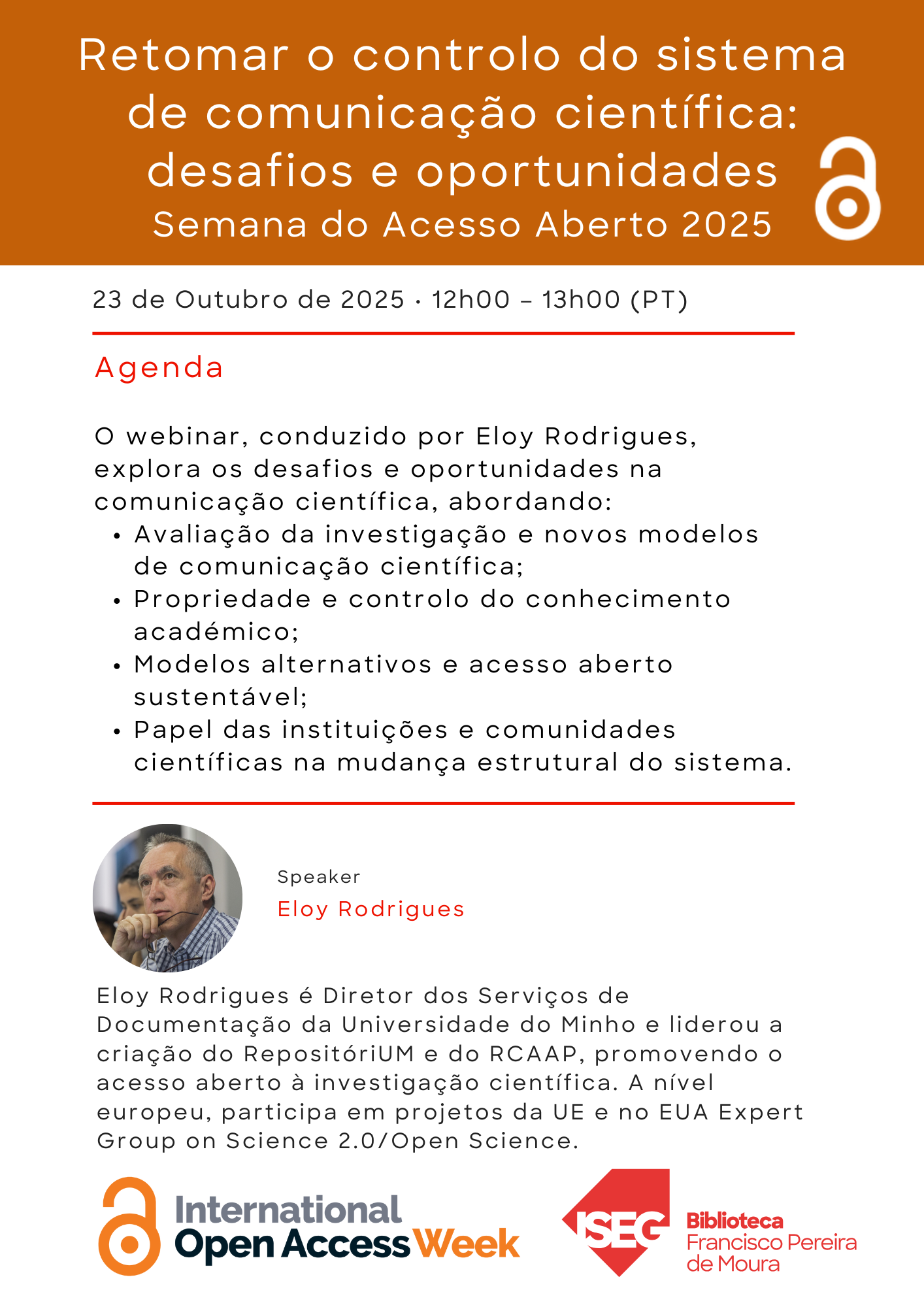| 23 de outubro de 2025 12h00-13h00 Online | Webinar | Retomar o controlo do sistema de comunicação científica: desafios e oportunidades Agenda Link do webinar |