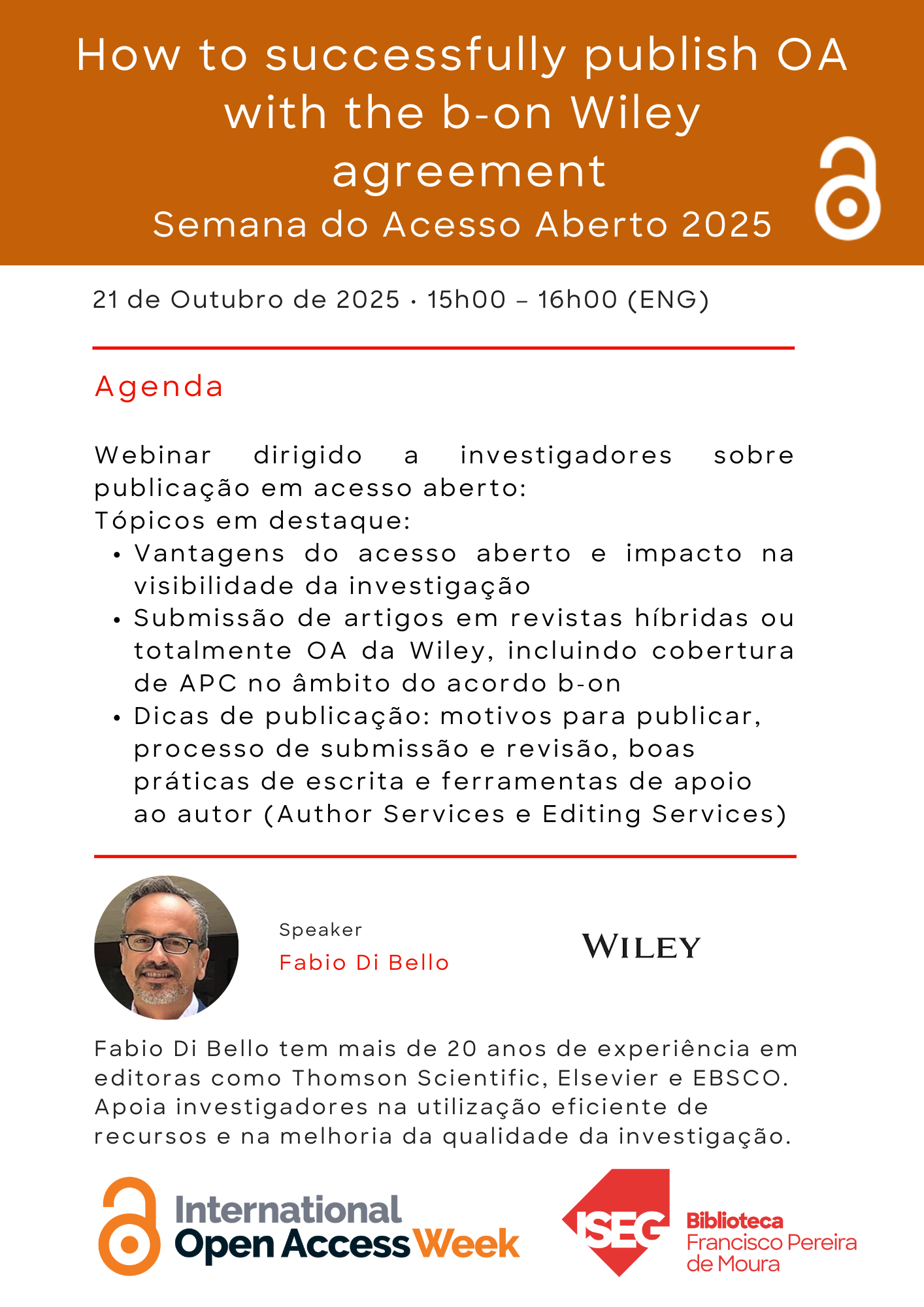 | 21 de outubro de 2025 15h00-16h00 Online | Sessão de formação | How to successfully publish OA with the b-on Wiley agreement Agenda Inscrição |